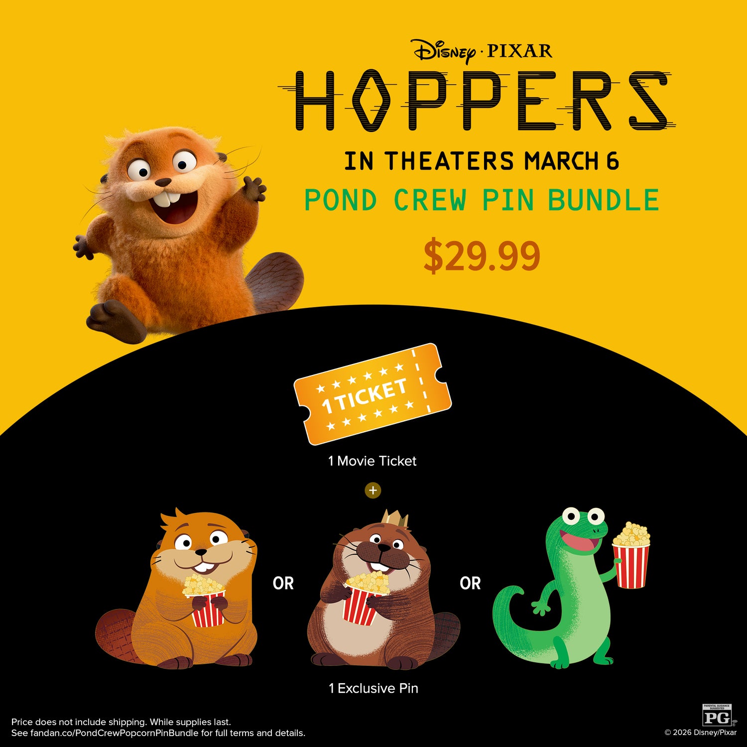 Hop into a whole new world! For $29.99, the Pond Crew Pin Bundle includes one (1) movie ticket to experience Hoppers on the big screen and one (1) Official Disney Exclusive Collector Pin featuring Mabel, King George or Tom. Jump into this new animal world that’s anything but ordinary.