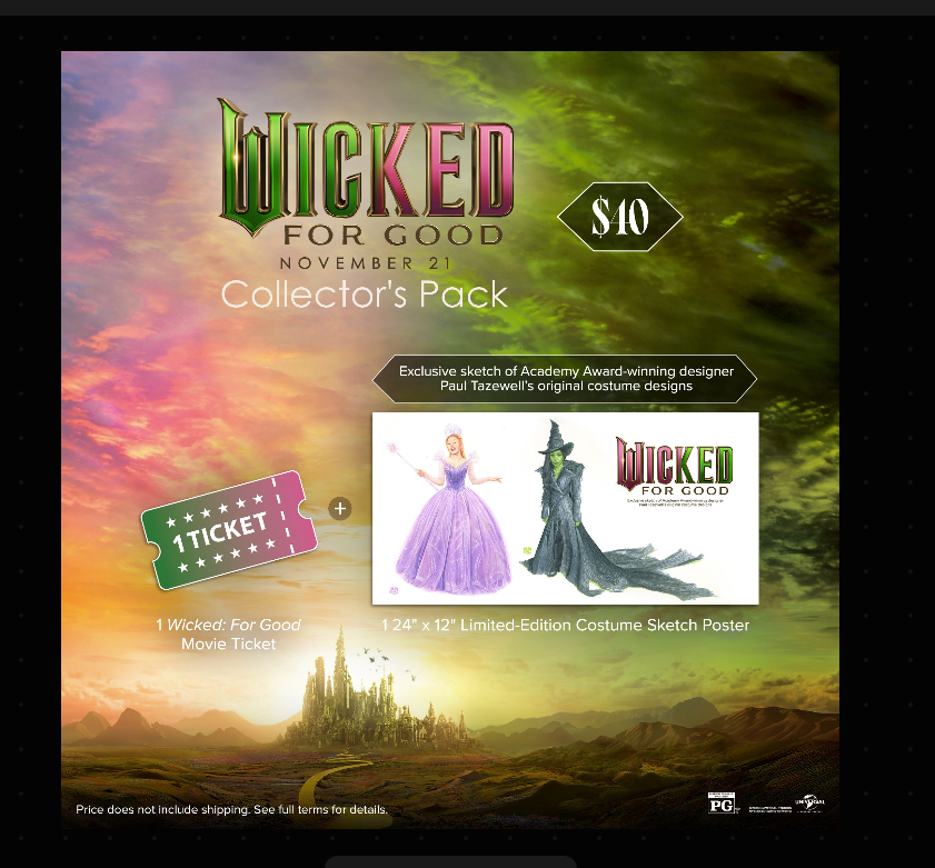 Step into the magic like never before and take a piece of Oz home with you with this exclusive For Good Collector’s Pack! For $40.00, get 1 ticket to Wicked: For Good on the big screen, plus an exclusive 24" x 12" sketch of Academy Award-winning designer Paul Tazewell's original costume design.