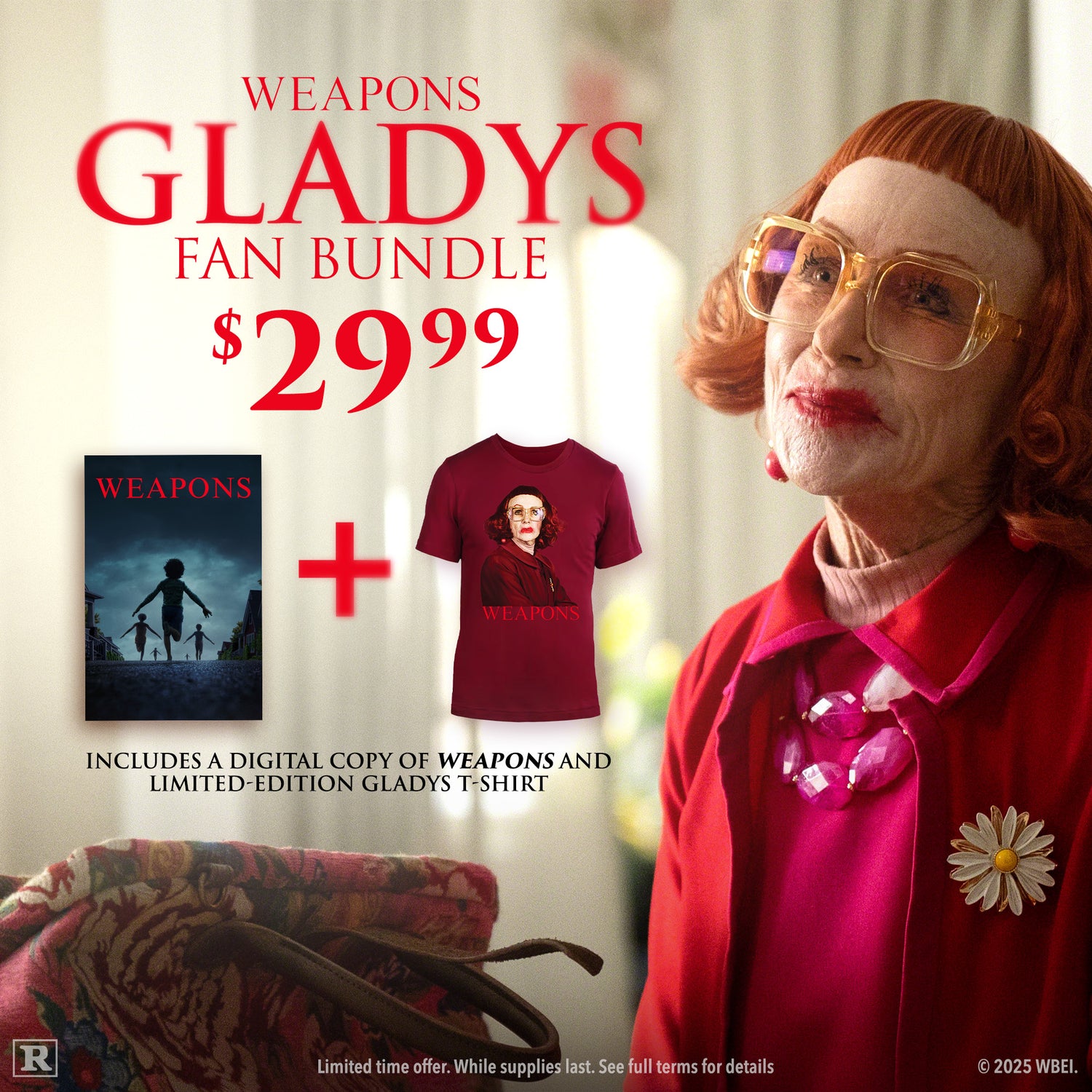 Prepare for Battle. Survive the Night. *10/21 - 11/3 only* For just $29.99, lock down the Aunt Gladys’ Bundle and receive 1 digital copy of Weapons on Fandango at Home plus the exclusive Aunt Gladys’ Weapons T-Shirt. This deadly deal won’t last - strike before it’s too late.