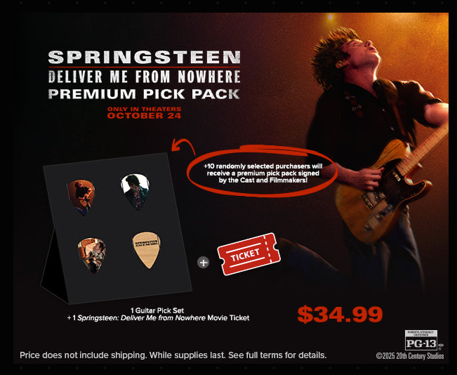 Celebrate The Boss with this exclusive bundle, only available for a limited time. All for just $34.99. Don’t miss your chance to own a piece of Springsteen history while catching the show on the big screen.