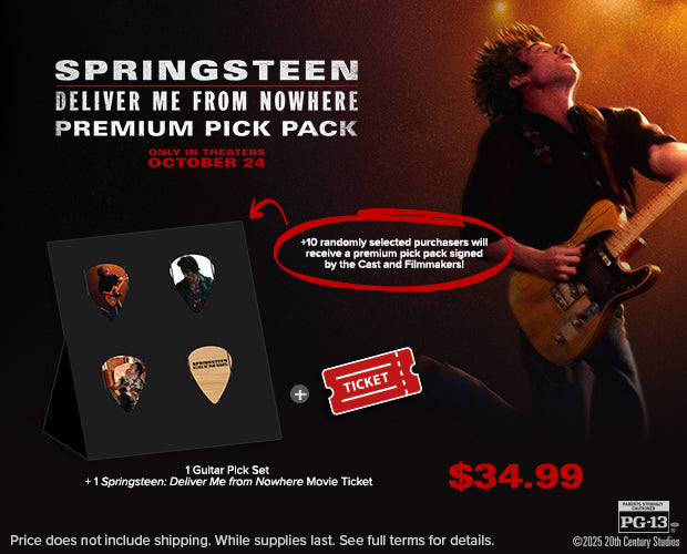 Price does not include shipping. After purchasing a bundle, the guitar picks will ship to the address provided (starting in October) and you will receive a separate email to redeem your Fandango Promo Code for 1 movie ticket to see Springsteen: Deliver Me from Nowhere.